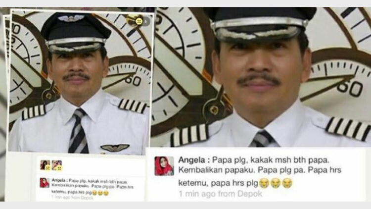 ക്യാപ്റ്റന്‍ ഇറിയാന്റോയുടെ ചിത്രവും ആഞ്ചെല സോഷ്യല്‍ മീഡിയായില്‍ പോസ്റ്റ് ചെയ്തിട്ടുണ്ട്. ഇന്നലെ രാവിലെ 6 മണിക്ക് ഇന്തോനേഷ്യയിലെ സുരഭയ സിറ്റിയില്‍ നിന്നും സിംഗപ്പൂരിലേക്ക് പുറപ്പെട്ട ക്യൂ ഇസഡ് 8501 വിമാനം 162 പേരുമായി കാണാതാകുകയായിരുന്നു.