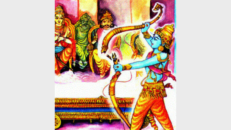 ശൈവചാപം വന്ദിച്ചുകൊണ്ട് ബ്രഹ്മന് ഞാന് ഈ വില്ല് കൈകൊണ്ടു തൊട്ടുനോക്കട്ടെ. അതുയര്ത്തുവാനും കുലയ്ക്കുവാനും ശ്രമിക്കുകയും ചെയ്യാം എന്നു ശ്രീരാമന് ചോദിച്ചപ്പോള് എല്ലാമാകുന്നതു ചെയ്താലും മടിക്കേണ്ട. കല്യാണമിതുമൂലം വന്നുകൂടീടുമല്ലോ എന്നു വിശ്വാമിത്രന് പറഞ്ഞു. ശ്രീരാമന് മന്ദഹാസത്തോടെ അടുത്തുചെന്ന് ജ്വലിച്ച തേജസ്സോടെ വേഗത്തില് വില്ലെടുത്ത് യാതൊരു ശ്രമവും കൂടാതെ കുലച്ചുവലിച്ചു. ആ സമയത്ത് വില്ലു രണ്ടായി മുറിഞ്ഞു. അതിന്റെ ശബ്ദം പതിന്നാലുലോകത്തിലും മാറ്റൊലിക്കൊണ്ടു.