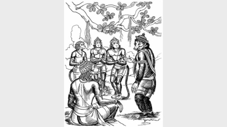 ഇതെല്ലാം കേട്ടുകൊണ്ടോ കേട്ടെങ്കില് തന്നെ ശ്രദ്ധിക്കാതേയോ തന്റെ കഴിവിനെപ്പറ്റി തനിക്കുതന്നെ അറിവില്ലാത്തപോലെ, ആത്മസ്ഥൈര്യവും തന്റേടവുമില്ലാത്തവനെപ്പോലെ ഹനുമാന് അടങ്ങിയൊതുങ്ങി കൂനിക്കൂടി ഒരിടത്ത് ഇരിക്കുന്നുണ്ടായിരുന്നു. പ്രസരിപ്പോടെ പ്രത്യുല്പന്നമതിയായ ജാംബവാന് കിഴവനെപ്പോലെ ഉത്സാഹഹീനനായി തളര്ന്നിരിക്കുന്ന ഹനുമാന്റെ അരികിലെത്തി തട്ടിയുണര്ത്തിക്കൊണ്ട് ചോദിച്ചു. എന്താണ് വായുപുത്രന് ഉത്സാഹമില്ലാത്തവനായി തളര്ന്നിരിക്കുന്നത്? പാര്വതീ ദേവിയുടെ ഗര്ഭാശയത്തില് വളര്ന്ന മഹാദേവ ബീജമാണല്ലോ ഭവാന്.