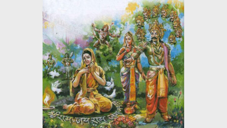 മാതൃക സതീരത്നമായ സീത ആ ദുരാചാരിയുടെ ആഗമനം അറിഞ്ഞനിമിഷത്തില് തന്നെ ആത്മധൈര്യത്തോടെ താന് രാവണനേയും തന്നെ രാവണനും കാണാന് ഇടയാകാത്തവിധം കാലുകള് മടക്കി തുടകളോട് ചേര്ത്തുവെച്ച് തല കുനിച്ച് കാല്മുട്ടില് ചേര്ത്ത് മുഖം കാണാനാകാത്ത വിധം ചുളുങ്ങിഒതുങ്ങി തന്നെ തന്നില്തന്നെയൊളിപ്പിച്ചവിധം ഇരിപ്പുറപ്പിച്ചു. എന്നിട്ടും മനസ്സമാധാനമില്ലാതെ രാമനെക്കുറിച്ചോര്ത്ത് നെടുവീര്പ്പുകളോടും രാവണനെക്കുറിച്ചോര്ത്തുള്ള വെറുപ്പോടുംകൂടി വിങ്ങി വിങ്ങി തേങ്ങിക്കരഞ്ഞുകൊണ്ട് സീത ഇരുന്നു.