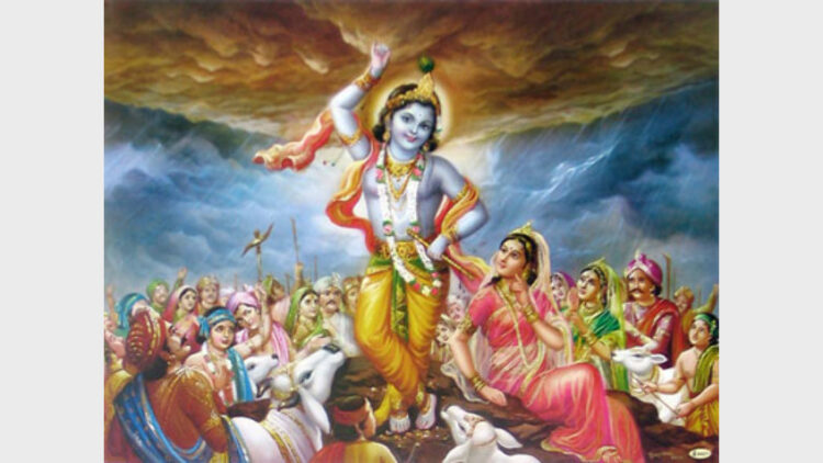 ഒടുവില് ഗോവര്ദ്ധനത്തിനെ പൂജ ചെയ്യാം എന്നതീരുമാനത്തിലെത്തി. എല്ലാവരും ഭക്തി പൂര്വ്വം യാഗം നടത്തുവാന് തയ്യാറായി. ദേവന്മാര് കൃഷ്ണന്റെ കളികളെ പറ്റി അറിഞ്ഞു. ദേവേന്ദ്രനും വരുണനും ചേര്ന്ന് ഇതിനെതിരെ ചിലതെല്ലാം ആസൂത്രണം ചെയ്തു. യാഗത്തിന് എല്ലാവരും വന്നുചേര്ന്നപ്പോള് പൊരിഞ്ഞ മഴ. കാലികളും മനുഷ്യരും തണുത്ത് വിറയ്ക്കാന് തുടങ്ങി. അതോടൊപ്പം കാറ്റും. അമംഗളം സംഭവിക്കുന്നതോര്ത്ത് എല്ലാവരും കണ്ണന്റെ സമീപത്തുചെന്നു. പുഞ്ചിരിയാണല്ലോ കണ്ണന്റെ മുഖമുദ്ര. എല്ലാവര്ക്കും കയറിനില്ക്കുവാന് പാകത്തിനുള്ള കുടയൊന്ന് ഭഗവാന് സംഘടിപ്പിച്ചു. സാക്ഷാല് ഗോവര്ദ്ധനത്തിനെ ഉയര്ത്തി അത് ചെറുവിരലിന്മേല് നിറുത്തിയത്രേ. ഗോലോകംമുഴുവന് ആനന്ദത്താല് തുള്ളിച്ചാടി. ഇന്ദ്രാദി ദേവകള് ആകെ വിഷമത്തിലായി.