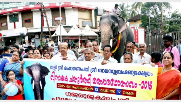 തളി ശ്രീ മഹാഗണപതി ശ്രീ ബാലസുബ്രഹ്മണ്യ ക്ഷേത്രത്തിലെ തെപ്പരഥോത്സവത്തില് ഗണപതിയുടെ തിടമ്പേറ്റാനായി കോഴിക്കോട്ടെത്തിയ പാറമേക്കാവ് പത്മനാഭന്