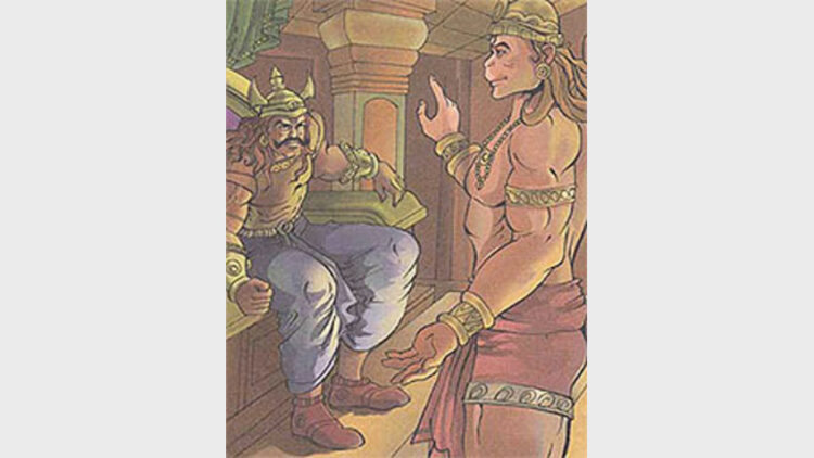 അംഗദന് സന്ദേശവുമായിരാവണ സഭയിലെത്തി സ്വയം പരിചയപ്പെടുത്തി. ഞാന് ബാലിയുടെ പുത്രനായ അംഗദനാണ്. ശ്രീ രാമചന്ദ്രന്റെ ദൂതനായാണ് വന്നിട്ടുള്ളത്. അദ്ദേഹം അങ്ങേക്കായി ഒരു സന്ദേശം തന്നയച്ചിട്ടുണ്ട്. സീതയെ മാന്യമായി രാമസമക്ഷം എത്തിച്ചില്ലെങ്കില് നിന്നെ ബന്ധുസമക്ഷം വംശത്തോടെ യമലോകത്തെക്കയക്കുമെന്നാണ് സന്ദേശച്ചുരുക്കം.