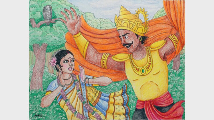 രാവണന് പറഞ്ഞു. എന്നെ ഭയപ്പെടാതെ ഭൂമിയില് ഒരു രാജാക്കന്മാരും സംസാരിച്ചിട്ടില്ല. വൈശ്രവണാനുജനും പൗലസ്ത്യ നന്ദനനുമായ രാക്ഷസരാജാവ് രാവണനാണ് ഞാന്. ഘോരമായ യുദ്ധം ചെയ്ത് ജ്യേഷ്ഠനെ തോല്പിച്ച് പുഷ്പകവിമാനം അദ്ദേഹത്തില് നിന്നു പിടിച്ചുവാങ്ങിയവനാണ് ഞാന്.
