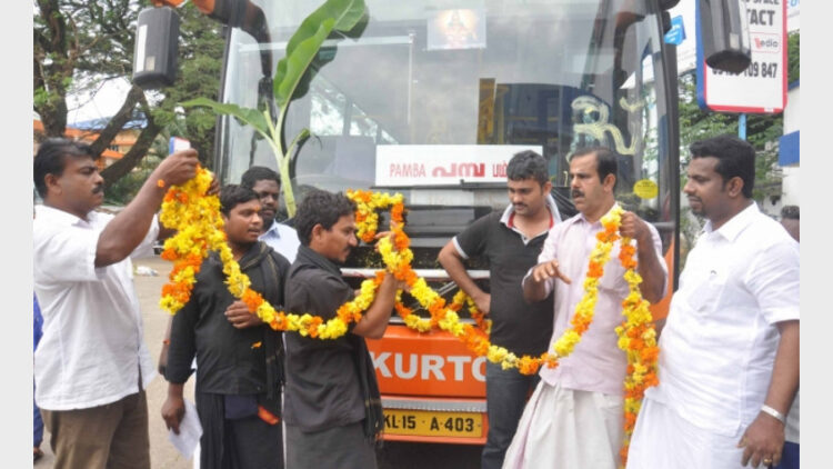 പമ്പയിലേക്കുള്ള കെഎസ്ആര്‍ടിസി ബസുകള്‍ അലങ്കരിച്ച് പ്രതിഷേധിച്ചു