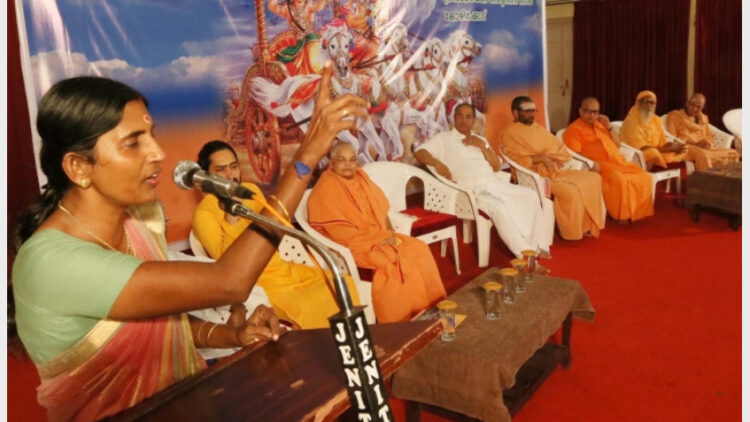 സനാതന ധര്‍മ്മ പരിഷത്തിന്റെ ഉദ്ഘാടന ചടങ്ങില്‍ ധര്‍മ്മജ്യോതി പുരസ്‌കാരം ഏറ്റുവാങ്ങിക്കൊണ്ട് സംസാരിക്കുകയായിരുന്നു അവര്‍. വാക്കാണ് ശക്തിയെന്ന് കരുതിയ തനിക്ക് ഈ വേദിയില്‍ മൗനമാണ് മഹദ് ശക്തിയെന്ന് തിരിച്ചറിവുണ്ടാവുകയാണ്. ആചാര്യന്മാരുടെ ഈ സദസ്സിന് നന്ദി പറയാന്‍ താനിന്നോളം ഉപയോഗിച്ച വാക്കുകള്‍ക്ക് കരുത്ത് പോരാതെ വന്നിരിക്കുന്നു. സനാതന ധര്‍മ്മം സംരക്ഷിക്കാന്‍ മഹത്തായ ത്യാഗം നടക്കുന്ന ലക്ഷാവധി സാധാരണ പ്രവര്‍ത്തകര്‍ക്കുള്ള അംഗീകാരമാണിത്. അവരുടെ ത്യാഗമാണ് തന്റെ വാക്കുകള്‍ക്ക് ശക്തി പകരുന്നത്. നമ്മളൊന്നാണെന്ന അവരുടെ സങ്കല്‍പ്പമാണ് തന്റെ ശക്തി. ഈ പുരസ്‌കാരത്തിന്റെ അവകാശികള്‍ അവരാണ്. പുരസ്‌കാരങ്ങളുടെ തിരസ്‌കാരങ്ങള്‍ നടക്കുന്നത് അതിന്റെ മഹിമ അറിയാത്തതുകൊണ്ടാണ്. അതിന്റെ പിന്നില്‍ ക്ഷുദ്രമായ താല്‍പ്പര്യങ്ങളാണുള്ളത്. അവര്‍ പറഞ്ഞു.