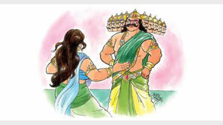 ”ഇവിടെ മുപ്പത്തിരണ്ടുകോടി രാക്ഷസന്മാര് താമസിക്കുന്നു. അവരുടെ രാജാവാണ് ഞാന്. എന്റെ മാത്രം ജോലിചെയ്യാനായി പതിനായിരം ഭൃത്യന്മാരുണ്ട്. സമുദ്രത്താല് ചുറ്റപ്പെട്ട നൂറുയോജന വിസ്താരമുള്ള ലങ്കയെ ആക്രമിക്കാന് ആരാലും സാധ്യമല്ല. എന്നെപോലെ വീരനായ ഒരാളെ ദേവന്മാരുടെയിടയിലോ യക്ഷന്മാരുടെയിടയിലോ കാണുകയില്ല. സകല ചരാചരങ്ങളും എനിക്കു ഭൃത്യവേല ചെയ്യും. കാട്ടില് കായ്കനികളും തിന്ന് അലഞ്ഞുനടക്കുന്ന മനുഷ്യനായ രാമനെക്കൊണ്ട് നിനക്കെന്തു പ്രയോജനം? അയാള്ക്ക് ഇവിടെ വരാനും കഴിയില്ല. നീ എന്റെ ഭാര്യയായിരുന്ന് ഈ സുഖഭോഗങ്ങളെല്ലാം അനുഭവിക്ക്.
