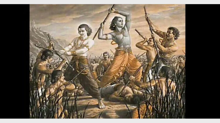 പാണ്ഡവരും കൗരവരും കുട്ടിക്കാലത്തു തുടങ്ങിയ വൈരം വളര്ന്നു വലുതായി. ചൂതുകളിയില് ചതികാണിച്ച് ധര്മപുത്രനെ തോല്പ്പിച്ച് ദുര്യോധനന് രാജ്യം കൈവശപ്പെടുത്തുന്നു. യുദ്ധം ഒഴിവാക്കുവാന് ദൂതുമായി ചെന്ന കൃഷ്ണനെയും അവര് അപമാനിച്ചുവിട്ടു. ഗത്യന്തരമില്ലാതെ യുദ്ധം ആരംഭിക്കുന്നു. ആരംഭിച്ച യുദ്ധത്തില് ഭഗവാന് പാണ്ഡവപക്ഷത്ത് മനസ്സുകൊടുത്തു നിന്നതിന്നാല് കൗരവപടപാടെ നശിച്ചു തകര്ന്നു.