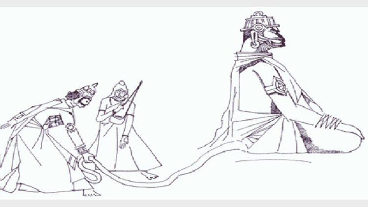 എന്നാലങ്ങനെ തന്നെയെന്നു പറഞ്ഞ് രാവണന് ഉടനെ പുഷ്പകവിമാനത്തില് കയറി കിഷ്കിന്ധയിലെത്തി, ബാലിയെ വെല്ലുവിളിച്ചു. ബാലി ദിവസവും നാലു സമുദ്രത്തില് തര്പ്പണം ചെയ്യും. അതിനായി പോയിരിക്കുന്നു. ഇപ്പോള് കിഴക്കേ സമുദ്രതീരത്തുണ്ട്. രാവണന് ക്ഷമയില്ലാതെ കിഴക്കേ സമുദ്രത്തിലെത്തി. തര്പ്പണം ചെയ്തുകൊണ്ടിരുന്ന ബാലിയുടെ വാലില് പിടിച്ചു വലിച്ചു. ബാലിയാകട്ടെ ഞൊടിയിടയില് രാവണനെ തന്റെ വാല്കൊണ്ട് ചുറ്റിവരിഞ്ഞു. രാവണന് ബാലിയുടെ വാലില് കുടുങ്ങി.