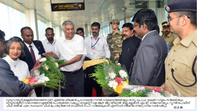കൊച്ചി: ഗുരുവായൂര്‍ ക്ഷേത്രദര്‍ശനത്തിനെത്തിയ ശ്രീലങ്കന്‍ പ്രധാനമന്ത്രി റനില്‍ വിക്രമസിംഗെയ്‌ക്ക് നെടുമ്പാശ്ശേരിയിലെ കൊച്ചി രാജ്യാന്തര വിമാനത്താവളത്തില്‍ സംസ്ഥാന സര്‍ക്കാരിന്റെ ഔദ്യോഗിക സ്വീകരണം നല്‍കി. സര്‍ക്കാരിന്റെ അതിഥിയായാണ് പ്രധാനമന്ത്രിയുടെ സന്ദര്‍ശനം.
