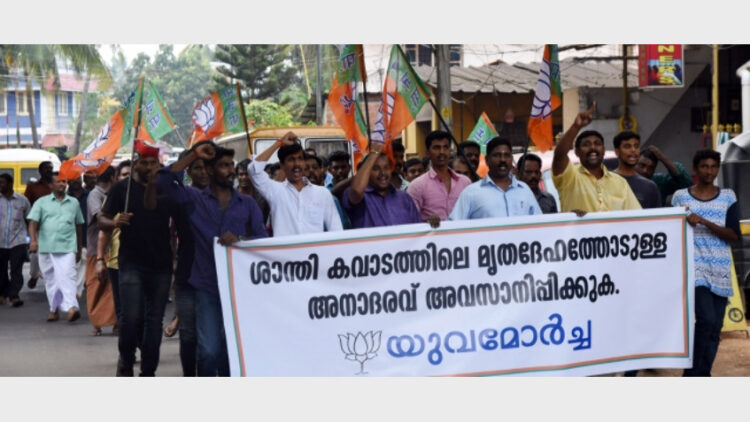 ഹൈന്ദവാചാരങ്ങള്‍ തകര്‍ക്കാന്‍ സിപിഎം ശ്രമിക്കുന്നുവെന്ന് അഡ്വ. ആര്‍എസ്. രാജീവ്: മൃതദേഹത്തോടും അവഗണന; യുവമോര്‍ച്ച ശാന്തികവാടത്തിലേക്ക് മാര്‍ച്ച് നടത്തി