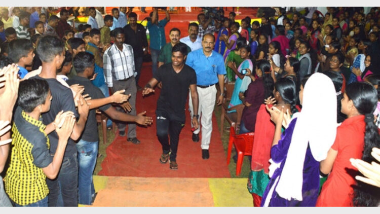 എസ്പിസി സംസ്ഥാനതല സമ്മര്‍ക്യാമ്പില്‍ എത്തിയ ഇന്ത്യന്‍ ക്രിക്കറ്റ് താരം സഞ്ചു സാംസണിന് കേഡറ്റുകള്‍ കൈകൊടുക്കുന്നു