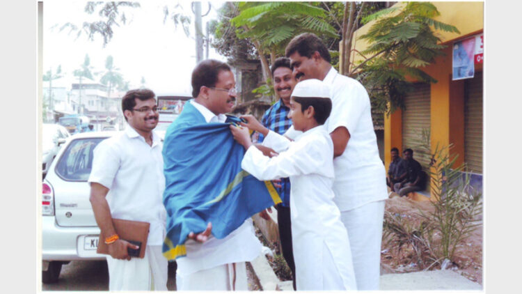 വി. മുരളീധരന് മുസ്ലിം ജമാ അത്ത് മദ്രസാ വിദ്യാര്‍ത്ഥി മുഹമ്മദ് ആഷിക് സ്വീകരണം നല്‍കിയപ്പോള്‍