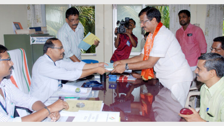 കോഴിക്കോട് സൗത്ത് നിയോജകമണ്ഡലം എന്ഡിഎ സ്ഥാനാര്ത്ഥി സതീഷ് കുറ്റിയില് വരണാധികാരി കൊമേഴ്സ്യല് ടാക്സ് ഡപ്യൂട്ടി കമ്മീഷണര് ഇന്റലിജന്സ് സി. ബാലകൃഷ്ണന് മുമ്പാകെ പത്രിക സമര്പ്പിക്കുന്നു