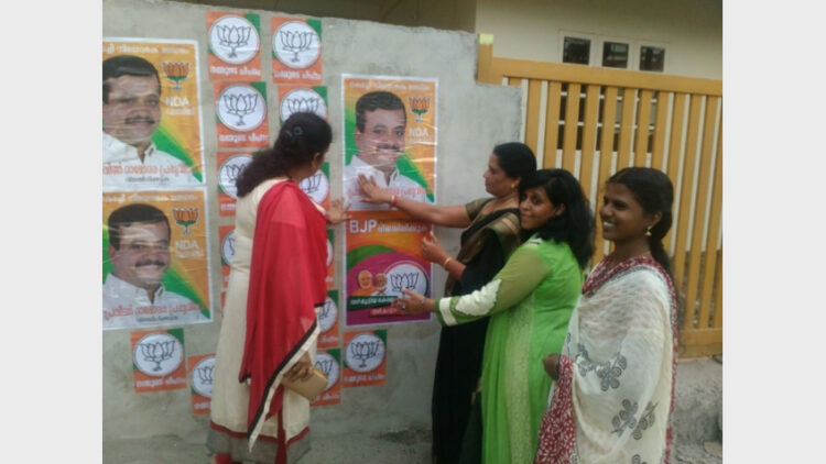 സ്ക്വാഡ് പ്രവര്ത്തനം, കുടുംബയോഗങ്ങള്, ബൂത്ത് സമ്പര്ക്കം, വോട്ടര് പട്ടിക പരിശോധന, മാതൃസംഗമങ്ങള് തുടങ്ങി വിവിധ തല പ്രവര്ത്തനങ്ങളില് സജീവമാകാറുള്ള സ്ത്രീ കൂട്ടായ്മ പ്രചരണ രംഗത്തെ പോസ്റ്റര് പരസ്യമേഖലയിലും കടന്നെത്തി തങ്ങളുടെ സജീവ സാന്നിധ്യം ജനകീയമാക്കുവാന് തയ്യാറായത് മറ്റൊരു കൗതുക കാഴ്ചയായി മാറി. പള്ളുരുത്തി, മട്ടാഞ്ചേരി മേഖലയില് പകല് സമയങ്ങളില് വീട്ടുകാരുടെ അനുമതി തേടിയാണ് മതിലുകളില് പോസ്റ്ററുകള് ഒട്ടിക്കുന്നത്.