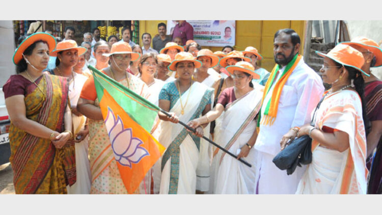 മഹിളാ മോര്ച്ച കോഴിക്കോട് നോര്ത്ത് മണ്ഡലം സംഘടിപ്പിച്ച വാഹന പ്രചാരണ ജാഥ ബിജെപി ജില്ലാ വൈസ് പ്രസിഡന്റ് പി. രമണീഭായ് കൗണ്സിലര് ജിഷ ഗിരീഷിന് പതാക കൈമാറി ഉദ്ഘാടനം ചെയ്യുന്നു. സ്ഥാനാര്ത്ഥി കെ.പി. ശ്രീശന് സമീപം.