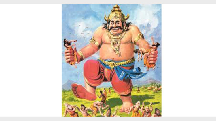 തീവ്രമായ ശത്രുതയൊടെത്തന്നെ കുംഭകര്ണന് ശ്രീരാമസേനയുമായി ഏറ്റുമുട്ടി. അനേകം വാനരന്മാരെ പിടിച്ചു വിഴുങ്ങി. അവര് ചെവിയില്കൂടി പുറത്തുചാടും. പിന്നെയും വിഴുങ്ങും. സുഗ്രീവന് ഒരുവലിയ മലയെടുത്തെറിഞ്ഞു. കുംഭകര്ണന് ശൂലമെടുത്ത് ഒരു കുത്ത്. സുഗ്രീവന് മോഹാലസ്യപ്പെട്ടു. അവനെയും എടുത്തുതോളത്തിട്ടുകൊണ്ട് നടക്കുമ്പോള് രാക്ഷസസ്ത്രീകള് പനിനീര് മഴ ചൊരിഞ്ഞു. അപ്പോള് സുഗ്രീവന് ബോധം തെളിഞ്ഞു.