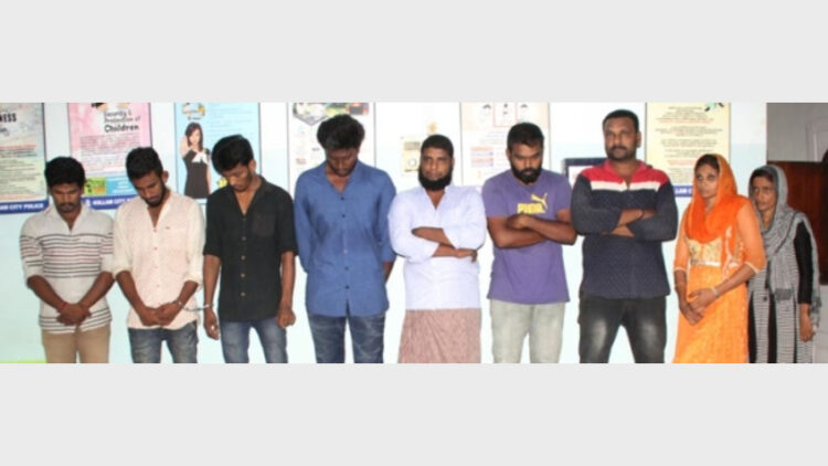 തിരുവനന്തപുരം നെയ്യാറ്റിന്‍കര പെരുംപഴതൂര്‍ ഇളവിനക്കര ആയില്യംകാവിന് സമീപം സുധീര്‍സദനത്തില്‍ ജയലാല്‍(23), ബാലരാമപുരം എ.വി സ്ട്രീറ്റില്‍ പട്ടാണിക്കൊടിതോപ്പ് വീട്ടില്‍ അക്ബര്‍ഷാ(24), മലപ്പുറം പെരുന്തല്‍മണ്ണ അനമങ്ങാട് ചോരാനിവാളയില്‍ കട്ടേക്കാട് വീട്ടില്‍ അബ്ദുള്‍സലാം(26), കോഴിക്കോട് കന്നൂര്‍ കൊയിലാണ്ടി ഉള്ളിയേരി വലയോട്ടില്‍ വീട്ടില്‍ ഇഷ എന്നു വിളിക്കുന്ന ജംഷീല(30), കോഴിക്കോട് കൊയിലാണ്ടി ഇരിങ്ങനം അയനിക്കാട് കെവി ഹൗസില്‍ ജസീല(33), നെയ്യാറ്റിന്‍കര അതിയന്നൂര്‍ കണ്ണറവിള രോഹിത് ഭവനില്‍ രോഹിത് എം.രാജ്(23), തിരുവനന്തപുരം കാരക്കാമണ്ഡപത്തിന് സമീപം പൊറ്റവിള വീട്ടില്‍ അഷറഫ്(31), നെടുമങ്ങാട് പത്താംകല്ല് വിഐപി ജംഗ്ഷന് സമീപം സുമയ്യ മന്‍സിലില്‍ അജി എന്നു വിളിക്കുന്ന അജിത്(28), ശാന്തിവിള യുപി സ്‌കൂളിന് സമീപം വാഴവിള വീട്ടില്‍ നിസാര്‍(31) എന്നിവരെയാണ് ഈസ്റ്റ് പോലീസ് അറസ്റ്റ് ചെയ്തത്. പ്രതികളെ തന്ത്രപൂര്‍വം തിരുവനന്തപുരത്തുനിന്നും അറസ്റ്റു ചെയ്യുകയായിരുന്നു. ഇക്കഴിഞ്ഞ രണ്ടിനായിരുന്നു കേസിനാസ്പദമായ സംഭവം നടന്നത്. തിരുവനന്തപുരം തൈക്കാട് സ്വദേശിയായ നാസറി(50)നെയാണ് സംഘം ബ്ലാക്ക് മെയില്‍ ചെയ്ത് 65000 രൂപ തട്ടിയെടുത്തത്. സംഘത്തില്‍പ്പെട്ട യുവാവ് നാസറിന്റെ മൊബൈല്‍ഫോണ്‍ നമ്പര്‍ ഇഷയ്‌ക്ക് നല്‍കുകയും ഇവര്‍ നാസറിനെ നിരന്തരം വിളിച്ച് ലൈംഗിക ബന്ധത്തിന് പ്രേരിപ്പിക്കുകയും ചെയ്തുവെന്ന് പോലീസ് പറഞ്ഞു. പ്രലോഭനത്തില്‍പ്പെട്ട നാസറിനെ ഇഷ മറ്റ് പ്രതികള്‍ പറഞ്ഞതുപ്രകാരം കൊല്ലത്തേക്ക് വിളിച്ചുവരുത്തുകയും നഗരത്തിലെ ഒരു പ്രമുഖ ഹോട്ടലില്‍ ദമ്പതികളെന്ന വ്യാജേന മുറിയെടുക്കുകയും ചെയ്തു.