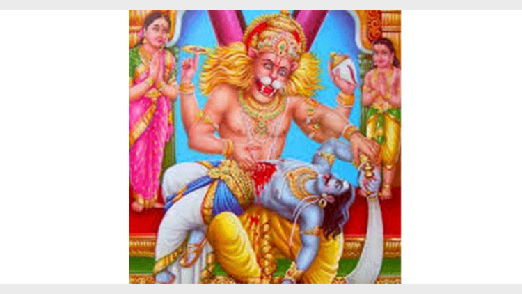 അസുരന് തൂണിന്മേല് ഇടിച്ചു. അതില് നിന്ന് ഭീകരനായ നരസിംഹംമൂര്ത്തി പ്രത്യക്ഷപ്പെട്ടു. കഴുത്തിന് മുകളില് സിംഹം, താഴെ മനുഷ്യന്. മനുഷ്യനും മൃഗവുമല്ല, പകലും രാത്രിയുമല്ല. ഇപ്പോള് തികഞ്ഞ സന്ധ്യാസമയം ഉമ്മറപ്പടിയില് അസുരനെ തന്റെമടിയില് മലര്ത്തിക്കിടത്തി രണ്ട്കൈയിലേയും നഖങ്ങള് മാറില്കുത്തിയിറക്കി അത് കീറിപ്പൊളിച്ചു. രക്തത്തില് കുളിച്ച നരസിംഹമൂര്ത്തിയെ ദേവന്മാര് സ്തുതിക്കാന് തുടങ്ങി.