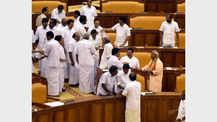 നിയമസഭയിലെത്തിയ ഒ. രാജഗോപാലിനോട് കുശലാന്വേഷണം നടത്തുന്ന എല്‍ഡിഎഫ്-യുഡിഎഫ്