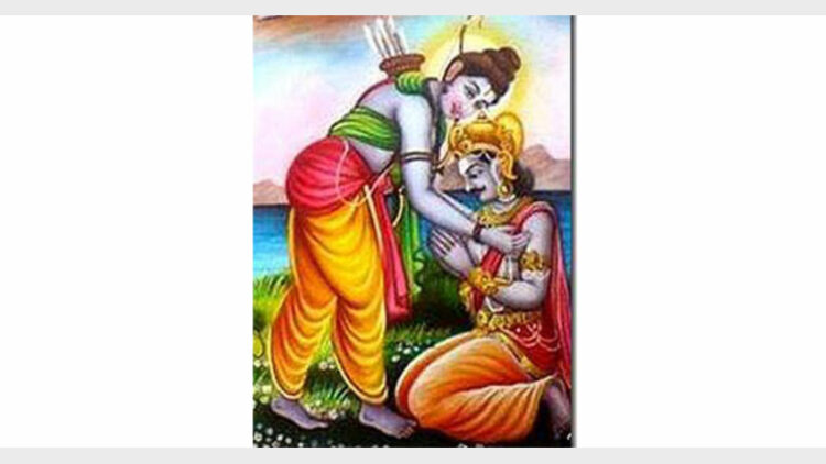 ആ സമയത്ത് വിഭീഷണന്‍ രാമനെ സമീപിച്ച് ഇന്ന് സീതയുമൊത്ത് മംഗളസ്‌നാനം ചെയ്യണമെന്നും താന്‍ നല്‍കുന്ന സല്‍ക്കാരം സ്വീകരിക്കണമെന്നും അപേക്ഷിച്ചു. അതിന് രാമന്റെ മറുപടി ”എന്റെ സോദരനായ ഭരതന്‍ അത്യന്തം സുകുമാരനും എന്റെ ഭക്തനുമാണ്. അവന്‍ ജടാവല്‍ക്കലങ്ങള്‍ ധരിച്ച് എന്റെ നാമവും ജപിച്ച് എന്നെ പ്രതീക്ഷിച്ചിരിക്കുകയാണ്. അവനെ കാണാതെ ഞാനെങ്ങനെയാണ് സ്‌നാനം ചെയ്യുന്നത്.