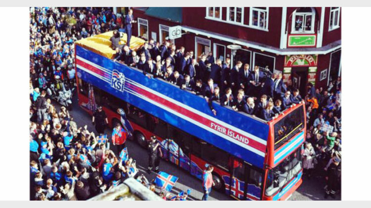 റെയ്ക്യവിക്: യൂറോകപ്പിൽ സ്വപ്നതുല്യ പ്രകടനം നടത്തി നാട്ടിൽ തിരിച്ചെത്തിയ ഐസ്ലൻഡ് ഫുട്ബോൾ ടീമിന് വീരോചിത സ്വീകരണം. രാജ്യ തലസ്ഥാനമായ റെയിക്യവിക്കിൽ ടീമംഗങ്ങളും പരിശീലകനും അടങ്ങുന്ന സംഘം തുറന്ന വാഹനത്തിൽ നഗരത്തെ വലംവച്ചു.