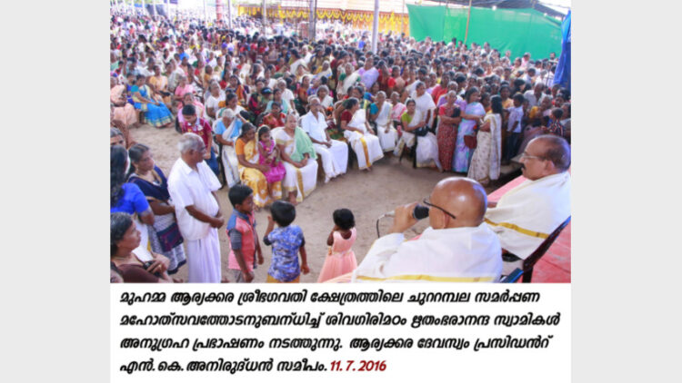 മുഹമ്മ: ക്ഷേമരാഷ്ട്രം കെട്ടിപ്പടുക്കാന് ക്ഷേത്രങ്ങള് കേന്ദ്രീകരിച്ച് സാംസ്ക്കാരിക കേന്ദ്രങ്ങള് തുടങ്ങണമെന്ന് ശ്രീനാരയണ ഗുരുദേവന് നിര്ദേശിച്ചിരുന്നതായി ശിവഗിരി മഠാധിപതി സ്വാമി ഋതംഭരാനന്ദ പറഞ്ഞു. മുഹമ്മ ആര്യക്കര ദേവീക്ഷേത്ര ചുറ്റമ്പല സമര്പ്പണ ചടങ്ങില് അനുഗ്രഹ പ്രഭാഷണം നടത്തുകയായിരുന്നു അദ്ദേഹം.