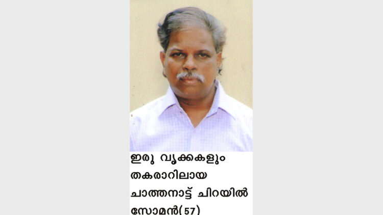 മുഹമ്മ: സോമന്റെ ജീവന്‍ നിലനിര്‍ത്താന്‍ ഭാര്യ അംബികയുടെ വൃക്കമാത്രം പോര; സുമനസ്സുകളുടെ സഹായം കൂടി വേണം. ഇരു വൃക്കകളും തകരാറിലായതിനെ തുടര്‍ന്ന് ആശുപത്രിയില്‍ ചികിത്സയില്‍ കഴിയുന്ന കഞ്ഞിക്കുഴി പഞ്ചായത്ത് 10-ാം വാര്‍ഡ് ചാത്തനാട്ട് ചിറയില്‍ സോമന്‍(57)ആണ് ചികിത്സാസഹായം തേടുന്നത്.