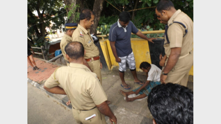 ചാക്ക പാര്വ്വതി പുത്തനാറിന് കുറുകെയുളള മേല്പ്പാലത്തില് അവശയായി കാണപ്പെട്ട അമ്മു എന്ന വൃദ്ധയെ പോലീസ് ബന്ധുക്കളെ ഏല്പിക്കുന്നു
