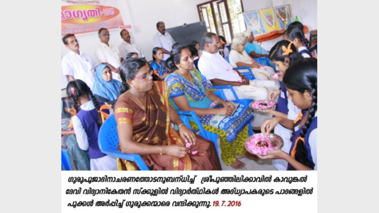 ചടങ്ങില് കാവുങ്കല് ദേവസ്വം പ്രസിഡന്റ് സി പി രവീന്ദ്രന് അധ്യക്ഷത വഹിച്ചു.പ്രിന്സിപ്പള് മനോഹരന് നന്ദികാട് ഗുരുപൂജ സന്ദേശം നല്കി. മാനേജര് ജി ഉണ്ണികൃഷ്ണന്, സെക്രട്ടറി കെ പി ബിജു, വൈസ്:പ്രിന്സിപ്പള് എ കെ ആശാറാണി,പി ടി എ പ്രസിഡന്റ് വി മധു,മാതൃസമതി പ്രസിഡന്റ് സിന്ധുശശി എന്നിവര് സംസാരിച്ചു.