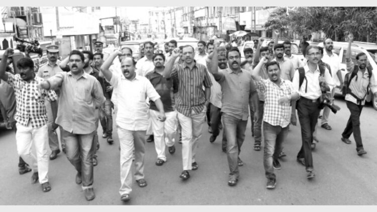 കോട്ടയം: ഹൈക്കോടതി വളപ്പില് മാധ്യമപ്രവര്ത്തകരെ ആക്രമിക്കുകയും നിരവധി പേരെ മര്ദ്ദിക്കുകയും ചെയ്ത അഭിഭാഷകരുടെ കാടത്തത്തില് പ്രതിഷേധിച്ച് കോട്ടയത്ത് കെയുഡബ്ലുജെ നേതൃത്വത്തില് മാധ്യമപ്രവര്ത്തകര് പ്രകടനവും യോഗവും നടത്തി. പഴയ പ്രസ്ക്ലബ്ബ് മന്ദിരത്തിനു സമീപത്ത് നിന്ന് ആരംഭിച്ച പ്രകടനം നഗരം ചുറ്റി ഗാന്ധിസ്ക്വയറില് സമാപിച്ചു. പ്രതിഷേധയോഗം പ്രസ്ക്ലബ്ബ് പ്രസിഡന്റ് എസ് മനോജ് ഉദ്ഘാടനം ചെയ്തു. ജില്ലാ സെക്രട്ടറി ഷാലു മാത്യു, ട്രഷറര് ശ്രീകുമാര് ആലപ്ര, ജോയിന്റ് സെക്രട്ടറി എസ് ശീജിത്ത്, സംസ്ഥാനകമ്മിറ്റിയംഗം സോമി സേവ്യര്, സിഎഎം കരീം എന്നിവര് സംസാരിച്ചു.