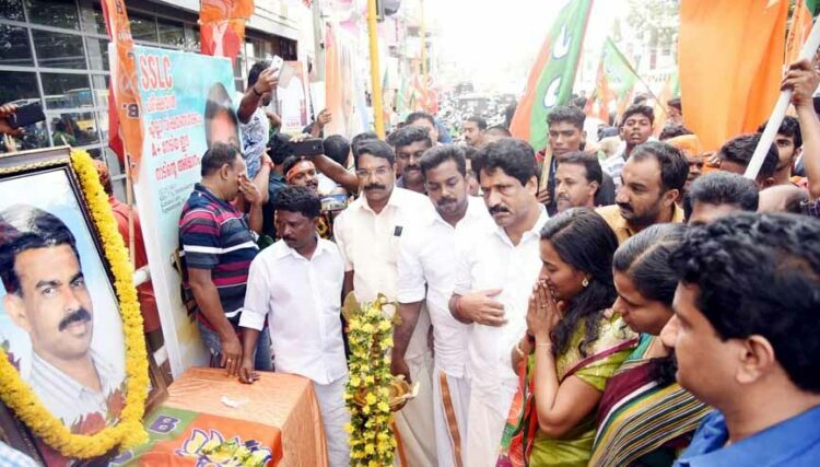 കൈമനം ജംഗ്ഷനിലൊരുക്കിയ മുന്‍ കൗണ്‍സിലര്‍ ചന്ദ്രന്റെ ചിത്രത്തിന് മുന്നില്‍ ദീപം തെളിച്ചപ്പോള്‍ വിങ്ങിപ്പൊട്ടുന്ന ആശാനാഥ്‌