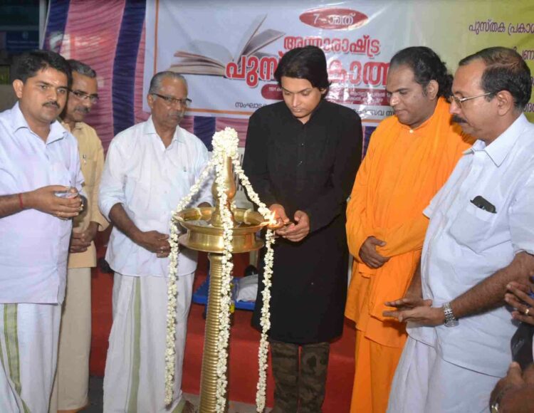 ആലപ്പുഴ ഐശ്വര്യ ഓഡിറ്റോറിയത്തില്‍ ഏഴാമത് അന്താരാഷ്‌ട്ര പുസ്തകോത്സവത്തിന് രാഹുല്‍ ഈശ്വര്‍ ഭദ്രദീപം തെളിയിച്ച് ഉദ്ഘാടനം ചെയ്യുന്നു