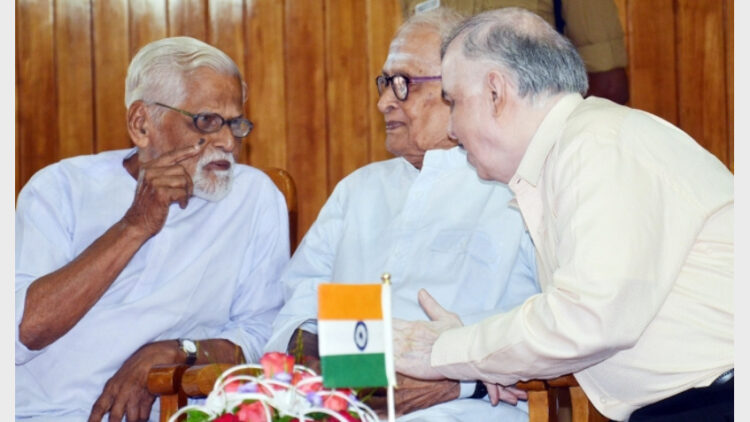 സ്വാതന്ത്ര്യസമരസേനാനികളെ ആദരിക്കാനായി രാജ്ഭവനില് ചേര്ന്ന യോഗത്തില് ഗാന്ധിയന് പി. ഗോപിനാഥന് നായരോടും അഡ്വ. കെ. അയ്യപ്പന് പിള്ളയോടും ഗവര്ണര് പി. സദാശിവം സൗഹൃദ സംഭാഷണത്തില്