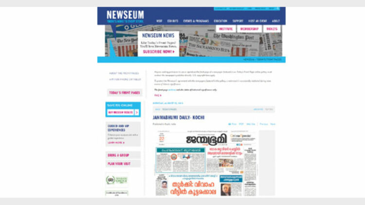 മൊത്തം 819 പത്രങ്ങളുടെ ഒന്നാം പേജുകളാണ് ഇതിന്റെ ഓണ്ലൈനില് കാണാവുന്നത് – അതില് ‘ജന്മഭൂമി’യുടെ ആറ് പതിപ്പുകളുടെയും ഒന്നാം പേജ് കാണാം. newseum.org സന്ദര്ശിച്ച് Asia നോക്കുക.