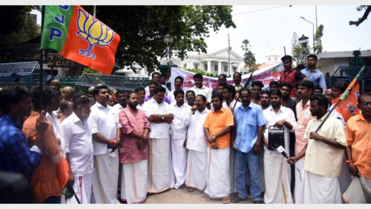 വയനാട് ആദിവാസി ഭൂമി തട്ടിപ്പ് കേസില്‍ ജുഡീഷ്യല്‍ അന്വേഷണം ആവശ്യപ്പെട്ട് പട്ടിക ജാതി മോര്‍ച്ചയുടെ നേതൃത്വത്തില്‍ സെക്രട്ടറിയേറ്റിന് മുന്നില്‍ നടത്തിയ ധര്‍ണ്ണ ബിജെപി സംസ്ഥാന ഉപാദ്ധ്യക്ഷന്‍ ഡോ. പി.പി. വാവ ഉദ്ഘാടനം ചെയ്യുന്നു. അഡ്വ. എസ്. സുരേഷ്, അഡ്വ. പി. സുധീര്‍ സമീപം