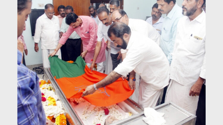 പാര്ട്ടി നേതാക്കള് ഡോക്ടര് മാധവന്റെ ഭൗതികദേഹത്തില് പാര്ട്ടി പതാക പുതപ്പിക്കുന്നു