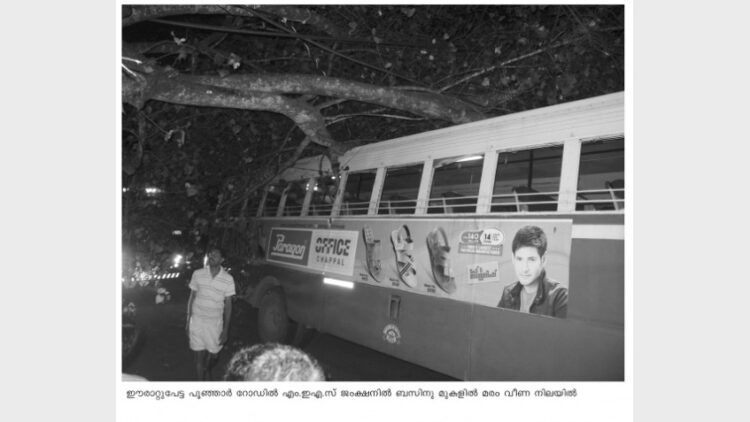 ഈരാറ്റുപേട്ടയില്‍ നിന്നും കുന്നോന്നിയിലേയ്‌ക്ക് പോയ ബസിനു മുകളിലാണ് റോഡ് വശത്തുനിന്ന തണല്‍മരം ഒടിഞ്ഞുവീണത്. ബസിന് മുമ്പിലായി വാനും ബൈക്കും കൂട്ടിയിടിച്ച് അപകടമുണ്ടായിരുന്നു. ബസ് സാവധാനമാണ് നീങ്ങിയിരുന്നത്. ഇതുമൂലം യാത്രക്കാര്‍ക്ക് മരം വീഴുന്നത് കാണുവാനും മാറുവാനും സാധിച്ചു.