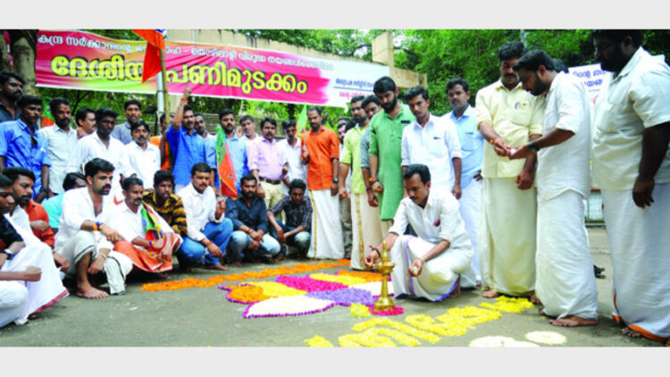 ബി. ദിബിന്, സിനൂപ് രാജ്, ശാലു, അഖില് കൊയിലാണ്ടി, അനൂപ്, ബബീഷ് ഉണ്ണികുളം, ഷിനു പിണ്ണാണത്ത് എന്നിവരും നേതൃത്വം നല്കി. ഹിന്ദുഐക്യവേദി പ്രവര്ത്തകര് കോഴിക്കോട് കോര്പ്പറേഷന് ഓഫീസിന് മുന്വശത്ത് പൂക്കളം തീര്ത്ത് നിലവിളക്ക് കൊളുത്തി പ്രതിഷേധിച്ചു. സംസ്ഥാന സെക്രട്ടറി ശശി കമ്മട്ടേരി, ജില്ലാ സംഘടന സെക്രട്ടറി കെ. ഷൈനു എന്നിവര് നേതൃത്വം നല്കി. മഹിളാമോര്ച്ച പ്രവര്ത്തകര് പിഡബ്ല്യുഡി ഓഫീസിന് മുന്വശത്തും പൂക്കളം തീര്ത്തു.