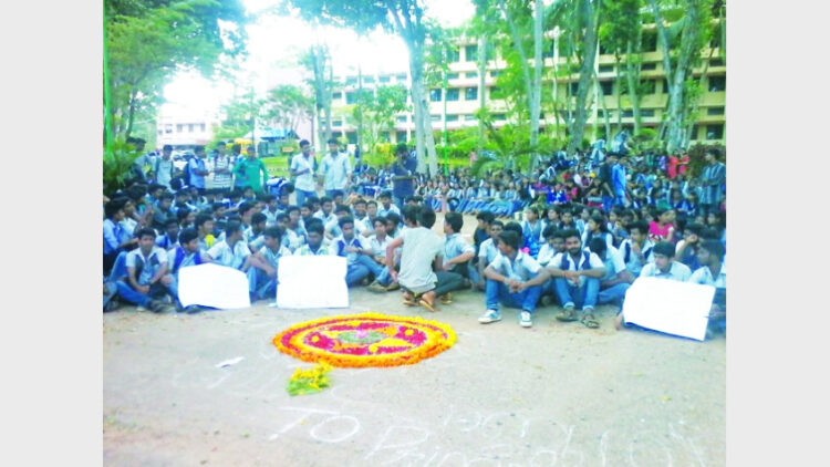 കാട്ടാക്കട ക്രിസ്റ്റ്യന്‍ കോളേജിനു മുന്നിലെ റോഡില്‍ അത്തപ്പൂക്കളമിട്ട് പ്രതിഷേധിക്കുന്ന വിദ്യാര്‍ത്ഥികള്‍