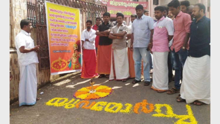 തൊടുപുഴ: കേരളത്തിന്റെ സംസ്കാരത്തെ വെല്ലുവിളിച്ചുകൊണ്ട് അത്തപ്പൂക്കളവും നിലവിളക്കും നിഷേധിച്ച പിണറായി സര്ക്കാരിന്റെ നടപടികള്ക്കെതിരെ യുവമോര്ച്ച ഇടുക്കി ജില്ലാ കമ്മറ്റിയുടെ നേതൃത്വത്തില് തൊടുപുഴ മിനി സിവില് സ്റ്റേഷനില് നിലവിളക്ക് കത്തിച്ചും പൂക്കളമിട്ടും പ്രതിഷേധിച്ചു. ബിജെപി ജില്ലാ ഉപാദ്ധ്യക്ഷന് പി ആര് വിനോദ് പ്രതിഷേധ സമരം ഉദ്ഘാടനം ചെയ്തു. യുവമോര്ച്ച സംസ്ഥാന കമ്മറ്റിയംഗം കെ കെ രാജു ഇടവെട്ടി, യുവമോര്ച്ച ഇടുക്കി ജില്ലാ പ്രസിഡന്റ് കൃഷ്ണകുമാര്, ജില്ലാ ജനറല് സെക്രട്ടറിമാരായ ബി വിജയകുമാര്, ജിന്സ് ജോണ്, ജില്ലാ വൈസ് പ്രസിഡന്റ് റിജോ എബ്രാഹം, തൊടുപുഴ നിയോജകമണ്ഡലം പ്രസിഡന്റ് മനു, മണ്ഡലം ഭാരവാഹികളായ അനീഷ്, വിഷ്ണു എന്നിവര് പ്രതിഷേധ സമരത്തിന് നേതൃത്വം നല്കി.