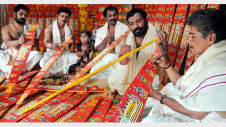 വില്ല് ചെത്തിമിനുക്കിയെടുത്ത് ചുവന്ന ചായം തേയ്ക്കും. പഞ്ചവര്ണ്ണപ്പൊടി ഉപയോഗിച്ച് നാലടി വില്ലുകളില് അനന്തശയനവും കാവല് ഭൂതങ്ങളേയും, ലക്ഷ്മിയേയും, താടകയേയും വരയ്ക്കുന്നു. ഇങ്ങനെ വില്ലുകളില് പല ഈശ്വരീയ രൂപങ്ങളേ വരയ്ക്കുന്നു. ചെങ്കല്പ്പൊടി, കരിപ്പൊടി, നീലയമരി, ചുണ്ണാമ്പുകല്ല്, വെള്ളപ്പൊടി, എന്നിവയാണ് ഉപയോഗിക്കുക. നാലുചുറ്റും കുരുത്തോലകൊണ്ട് അലങ്കരിച്ച് ചുവന്ന ഞാണ്കെട്ടുന്നു. ഇത്തരത്തില് എട്ടുവില്ല് നിര്മ്മിക്കും. മൂന്നുദിവസം വീട്ടിലെ കുടുംബക്ഷേത്രത്തില് പൂജിക്കുന്നു.