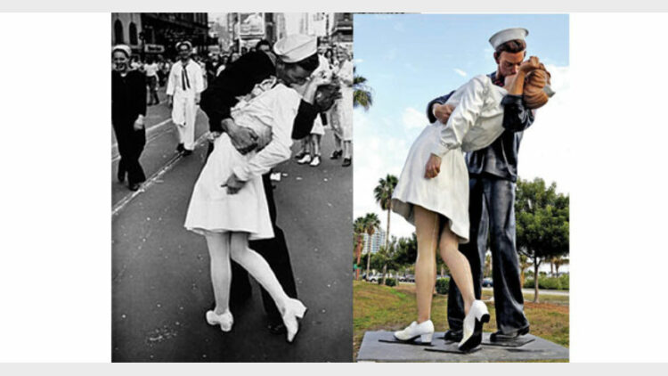 ചിത്രം ശില്‍പ്പമാക്കിയത് സെവാര്‍ഡ് ജോണ്‍സണ്‍. ആല്‍ഫ്രഡ് എടുത്ത ചിത്രത്തിന്റെ രൂപമാണത്. അതല്ല, വിക്ടര്‍ ജോര്‍ഗന്‍സണ്‍ എന്ന അത്ര പ്രസിദ്ധനല്ലാത്ത ഒരാളുടെ ചിത്രമാണ് ആധാരമെന്ന് ജോണ്‍സണ്‍ പറഞ്ഞിട്ടുണ്ട്. ആദ്യം ശില്‍പ്പം ഫ്‌ളോറിഡയിലും പിന്നീട് കാലിഫോര്‍ണിയയിലേക്കും ന്യൂയോര്‍ക്ക് സിറ്റിയിലേക്കും മാറ്റി. ഇതിന്റെ പകര്‍പ്പുകള്‍ മറ്റിടങ്ങളിലും സ്ഥാപിച്ചു.