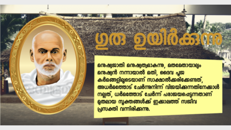 അതിനാല്‍, മനുഷ്യജാതി മനുഷ്യത്വമാകുന്നു, മതമേതായാലും മനുഷ്യന്‍ നന്നായാല്‍ മതി, ദൈവ പൂജ കര്‍മങ്ങളിലൂടെയാണ് സാക്ഷാല്‍ക്കരിക്കേണ്ടത്, അധര്‍മത്തോട് ചേര്‍ന്നുനിന്ന് വിജയിക്കുന്നതിനേക്കാള്‍ നല്ലത്, ധര്‍മത്തോട് ചേര്‍ന്ന് പരാജയപ്പെടുന്നതാണ് മുതലായ സൂക്തങ്ങള്‍ക്ക് ഇക്കാലത്ത് സജീവ പ്രസക്തി വന്നിരിക്കുന്നു. ആ പശ്ചാത്തലത്തില്‍, ഗുരുവിന്റെ ഉയിര്‍ത്തെഴുന്നേല്‍പ്പാണ് ഇപ്പോള്‍ സംഭവിച്ചുകൊണ്ടിരിക്കുന്നതെന്ന് ഞാന്‍ കാണുന്നു.