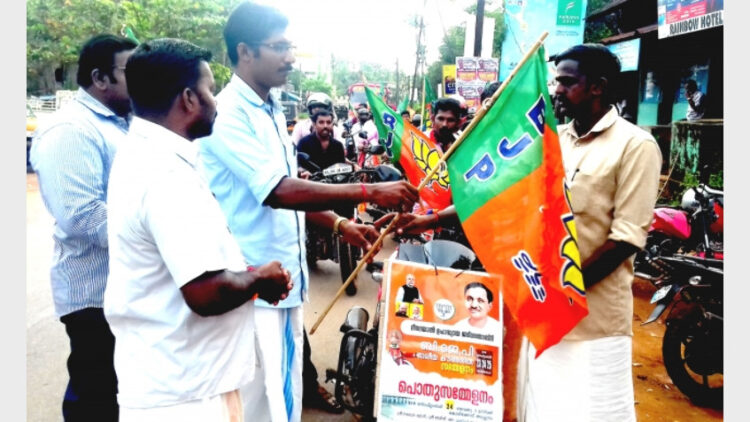 ഇരിട്ടിയില്‍ നടന്ന ബൈക്ക് റാലി യുവമോര്‍ച്ച ജില്ലാ വൈസ് പ്രസിഡന്റ് അജേഷ് നടുവനാട് മണ്ഡലം പ്രസിഡന്റ് പ്രിജേഷ് അളോറക്ക് പതാക കൈമാറിക്കൊണ്ട് ഉദ്ഘാടനം ചെയ്യുന്നു