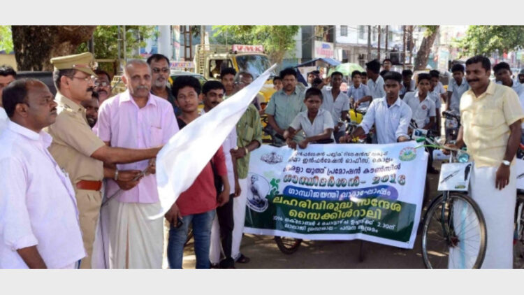കൊല്ലം: ഗാന്ധിജയന്തി വാരാഘോഷങ്ങളോടനുബന്ധിച്ച് ലഹരിവിരുദ്ധ സന്ദേശവുമായി കരുനാഗപ്പള്ളിയില് സൈക്കിള് റാലി നടത്തി. ഇന്ഫര്മേഷന്-പബ്ലിക് റിലേഷന്സ് വകുപ്പും കേരള യൂത്ത് പ്രമോഷന് കൗണ്സിലും സംയുക്തമായി സംഘടിപ്പിച്ച പരിപാടി ലാലാജി ഗ്രന്ഥശാലക്കു സമീപം നഗരസഭാ കൗണ്സിലര് ആര്.രവീന്ദ്രന്പിള്ള ഫഌഗ് ഓഫ് ചെയ്തു. ജില്ലാ ഇന്ഫര്മേഷന് ഓഫീസര് സി. അജോയ് ആമുഖപ്രഭാഷണം നടത്തി. യൂത്ത് പ്രമോഷന് കൗണ്സില് ചെയര്മാന് സുമന്ജിത്ത് മിഷ അധ്യക്ഷതവഹിച്ചു. എക്സൈസ് ഇന്സ്പെക്ടര് എം.ഹാഷിം ലഹരിവിരുദ്ധ സന്ദേശം നല്കി. മുനിസിപ്പല് കൗണ്സിലര്മാരായ എം.കെ.വിജയഭാനു, എം.ഷംസുദ്ദീന്, ജി.സാബു, എം.പി.ഫിലിപ്പ്, ജി.എസ്.പ്രസൂ, മുഹമ്മദ് എന്നിവര് പങ്കെടുത്തു. കരുനാഗപ്പള്ളി കെഡി മെമ്മറിയല് വൊക്കേഷണല് ഹയര് സെക്കന്ഡറി സ്കൂളിലെ കുട്ടികള്ക്കൊപ്പം യൂത്ത് പ്രമോഷന് കൗസില് അംഗങ്ങളും പങ്കെടുത്ത റാലി പന്മന ആശ്രമത്തില് സമാപിച്ചു. ആശ്രമത്തില് മഹാത്മഗാന്ധി താമസിച്ച മുറി സന്ദര്ശിച്ച സംഘം ആശ്രമവളപ്പില് ഗാന്ധിജിക്കുവേണ്ടി മീരാബെന് ന’ വൃക്ഷത്തിന്റെ ചുവട്ടില് പുഷ്പാര്ച്ചനയും നടത്തി.