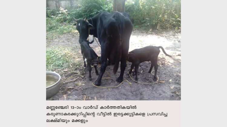 മുഹമ്മ: മൂന്നാം പ്രസവത്തില്‍ ലക്ഷ്മിക്കുട്ടി ഇരട്ടകള്‍ക്ക് ജന്മം നല്‍കി. മണ്ണഞ്ചേരി പഞ്ചായത്ത് 13-ാം വാര്‍ഡില്‍ കാര്‍ത്തികയില്‍ കരുണാകരകുറുപ്പിന്റെ പശുക്കളില്‍ ഒന്നാണ് ലക്ഷ്മി. ഒരുവയസുള്ള ദേവിയും ആറുമാസമായ സീതയും ഇളംതലമുറയെ നോക്കി മുരടനക്കി സമീപത്തുണ്ട്.