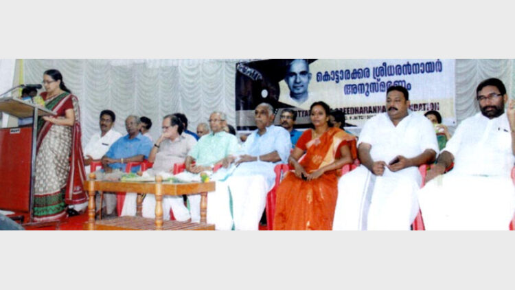 കൊട്ടാരക്കര: കൊട്ടാരക്കര ശ്രീധരന്നായര് അനുസ്മരണ സമ്മേളനം അയിഷാപോറ്റി എംഎല്എ ഉദ്ഘാടനം ചെയ്തു. ശ്രീധരന്നായര്ക്ക് ഉചിതമായ സ്മാരകം കൊട്ടാരക്കരയില് നിര്മ്മിക്കേണ്ടത് കാലഘട്ടത്തിന്റെ ആവശ്യമാണെന്ന് എംഎല്എ പറഞ്ഞു. ഫൗണ്ടേഷന് ചെയര്മാന് പി.എന്.ഗംഗാധരന് നായര് അധ്യക്ഷ്യത വഹിച്ചു. ശ്രീധരന്നായരുടെ പേരില് ചലച്ചിത്രവികസന കോര്പ്പറേഷന്റെ തിയേറ്റര് കോംപ്ലക്സ് നിര്മ്മിക്കാനുള്ള ആലോചനകള് നടക്കുന്നതായി കോര്പ്പറേഷന് ഡയറക്ടര് അമ്പലക്കര അനില്കുമാര് പറഞ്ഞു. സംസ്ഥാനത്തുടനീളം 12 തിയേറ്ററുകളാണ് കോര്പ്പറേഷന് നിര്മ്മിക്കുന്നത്. ചലച്ചിത്രതാരം ടി.പി.മാധവന് ശ്രീധരന്നായര് അനുസ്മരണപ്രഭാഷണം നടത്തി. വിവിധ മേഖലകളിലെ പ്രവര്ത്തന മികവിന് ടി.പി.മാധവന്(ചലച്ചിത്രം), ബേബിക്കുട്ടന്(നാടകം), കൊട്ടാരക്കര ഗംഗ, കൊട്ടാരക്കര ഭദ്ര(കഥകളി), ഡോ.പി.സേതുനാഥന്(സാഹിത്യം) എന്നിവരെ യോഗത്തില് ആദരിച്ചു. ജി.കലാധരന്, നഗരസഭാ ഉപാധ്യക്ഷന് എ.ഷാജു, കൗണ്സിലര്മാരായ എസ്.ആര്.രമേശ്, സി.മുകേഷ്, അഡ്വ.ഉണ്ണികൃഷ്ണമേനോന്, കോശി കെ.ജോണ്, ആര്.അമ്പിളി, ചലച്ചിത്ര താരങ്ങളായ ശോഭാ മോഹന്, വിനുമോഹന് തുടങ്ങിയവര് സംസാരിച്ചു.