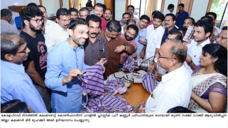 കണ്ണൂര്‍: പ്ലാസ്റ്റിക് ഫ്രീ കണ്ണൂര്‍ കാംപയിന്റെ ഭാഗമായി കലക്ടറേറ്റില്‍ നടന്ന കൈത്തറി ക്യാരിബാഗുകളുടെ വില്‍പ്പന കോണ്‍ഫറന്‍സ് ഹാളില്‍ നടന്ന ചടങ്ങില്‍ ജില്ലാ കലക്ടര്‍ മിര്‍ മുഹമ്മദലി ഉദ്ഘാടനം ചെയ്തു.