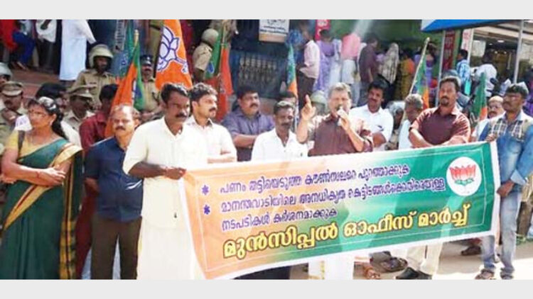 മാനന്തവാടി മുന്സിപാലിറ്റിയിലേക്ക് ബിജെപി നടത്തിയ മാര്ച്ച് മണ്ഡലം ജനറല് സെക്രട്ടറി കൂവണ വിജയന് ഉദ്ഘാടനം ചെയ്യുന്നു